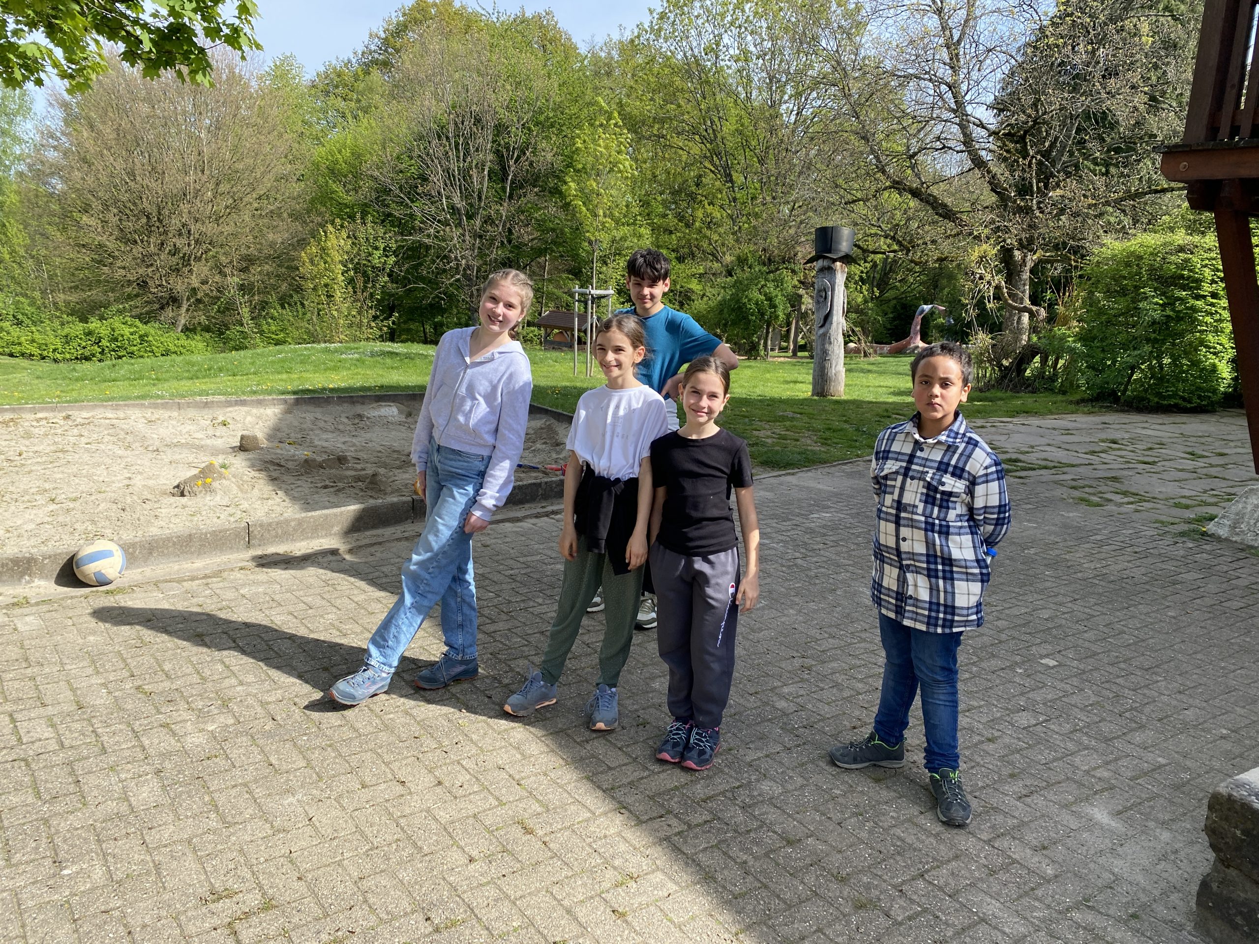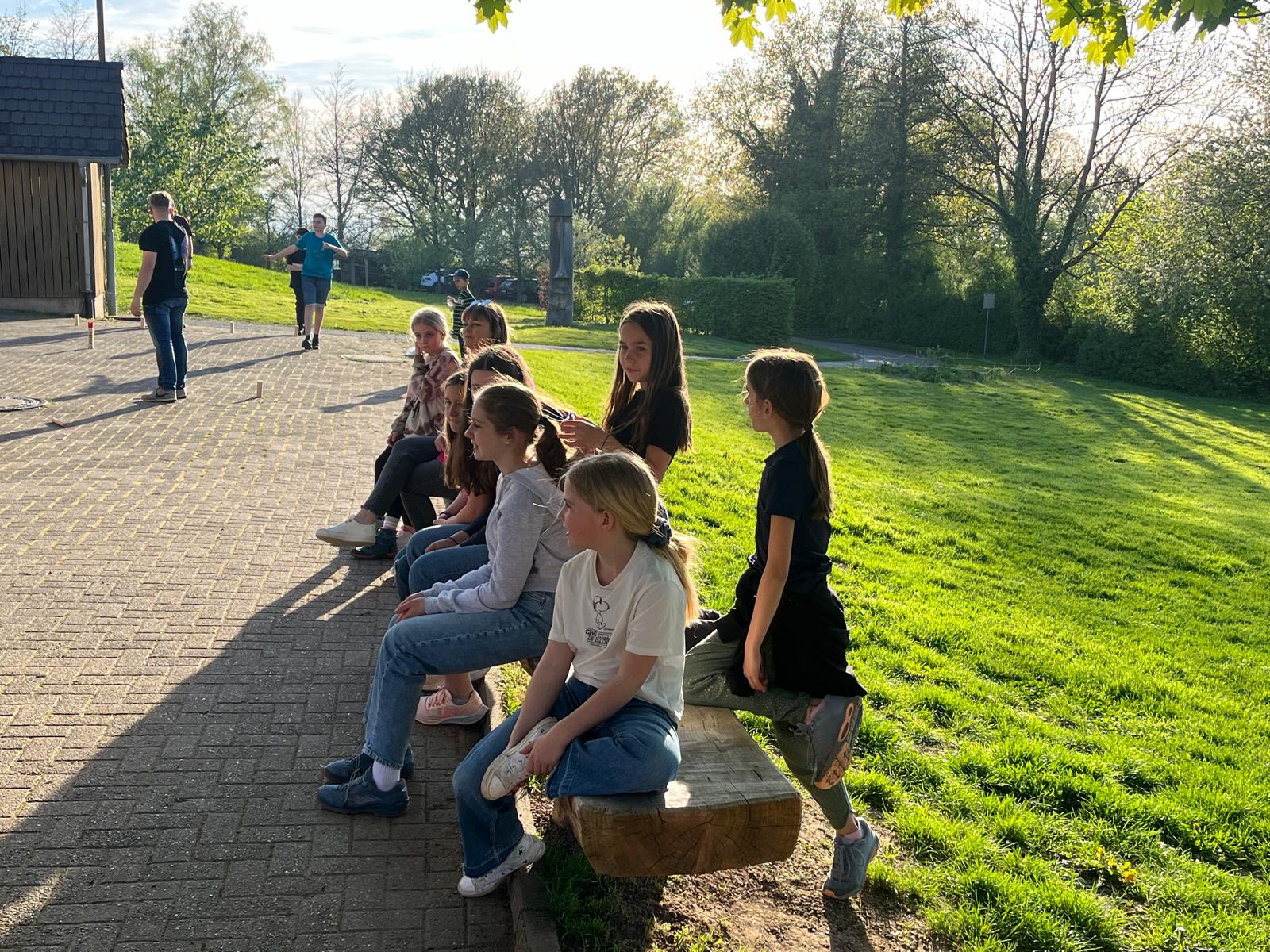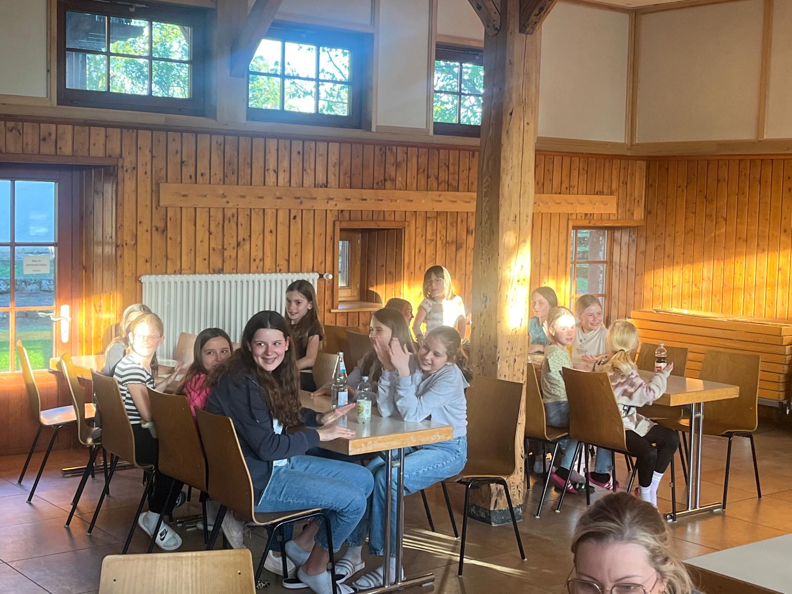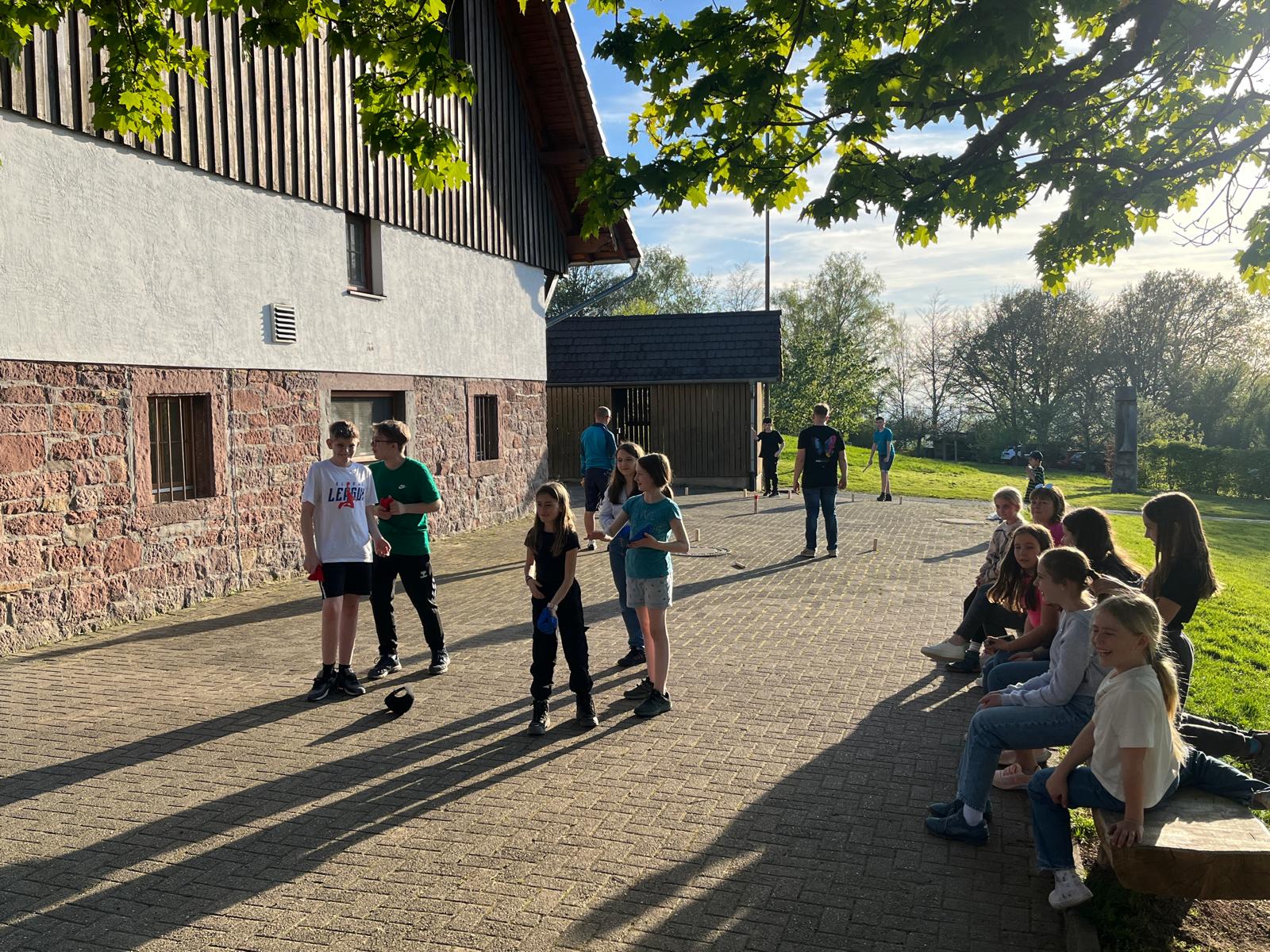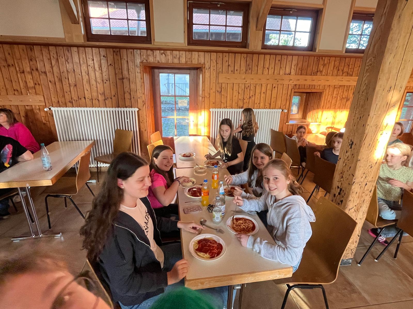 Unser Gepäck wurde mit Autos hochgefahren. Die Wanderung war anstrengend, hat aber allen großen Spaß bereitet. Nachdem alle heil angekommen waren, haben wir die Zimmereinteilungen gemacht und anschließend die Betten bezogen. Danach war die Zeit zur freien Verfügung. Es wurde geschaukelt, gespielt und wir hatten einfach Spaß. Zur Stärkung gab es zwischendurch Spaghetti-Eis. Lecker…! Das Highlight war aber das Fußballspiel, das nach dem Eisessen stattgefunden hat. Nach dem Fußballspiel gingen alle erschöpft zum Lagerfeuer. Als es dunkel genug war, machten wir eine Nachtwanderung. Leider sahen wir weder Tiere noch Gespenster. Doch so schön der Tag auch war, die Nacht war nicht ganz so schön: es war sehr laut und die meisten Kinder konnten erst gegen 2 Uhr einschlafen. Und um halb sieben waren wir dann auch schon wieder wach.
